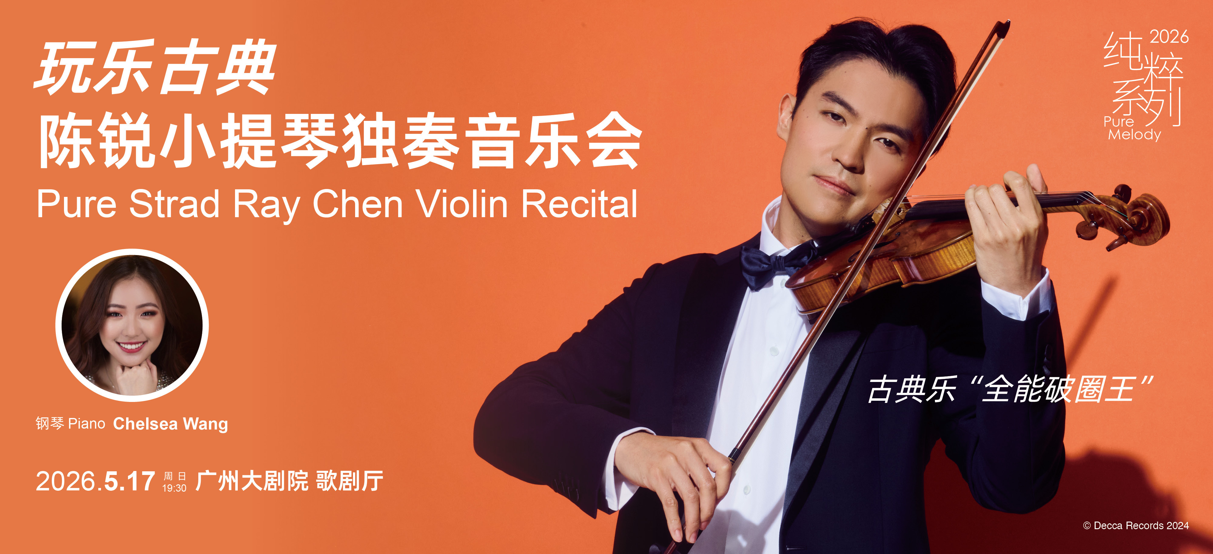 前年以演绎引爆羊城、创下盛况的小提琴家陈锐,将于5月17日再度归来。此番他将联袂后生钢琴家Chelsea Wang,以莫扎特的灵动、巴赫的难懂、萨拉萨蒂的炫技与格里格的抒怀,再行丈量古典音乐的无穷可能。