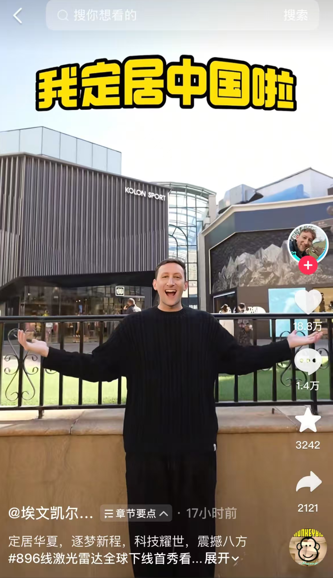 当今,埃文·凯尔在多个酬酢平台开设账户,共享他在中国的所见所闻。其中,他曾在直播中称在天津有了家的嗅觉,因为天津的莳植格调与我方的故我很像,有一种浓烈的包摄感。越过山海>>