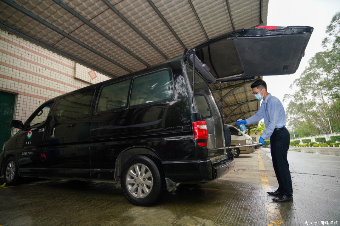 4月2日,小贤在清洗灵车。清远日报记者 刘淑芳 摄