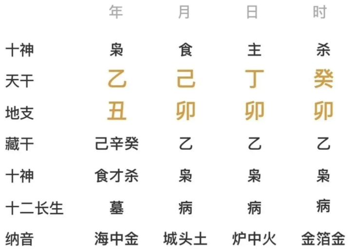乾造:乙丑年,己卯月,丁卯日,癸卯时(戌亥空)