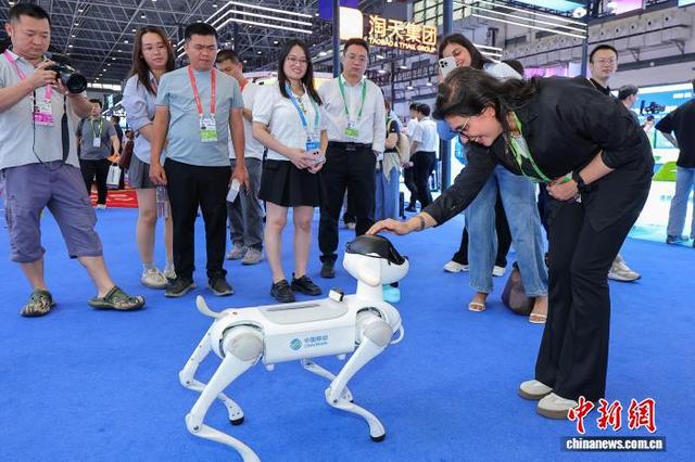 4月13日,第六届中国国外蹂躏品展览会在海南海口举办。多款智能机器东说念主集会亮相展会现场,凭借前沿科技与鼎新利用蛊卦不少参不雅者安身不雅看、互动体验。图为一位外籍参不雅者与展出的机器狗互动。中新社记者 骆云飞 摄