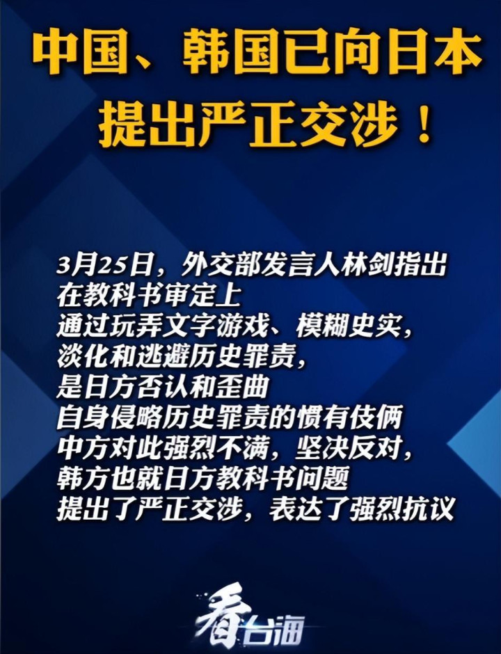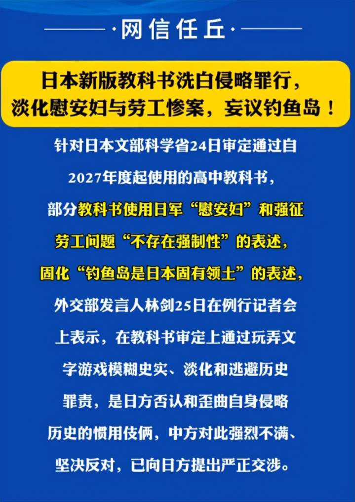 就在日本文部科学省完成教科书签订的第二天,酬酢部记者会上,发言东谈主林建措辞径直,直呼其名地指出,日本改变教科书的举止,就是其否定和歪曲扰乱历史的惯有伎俩。
